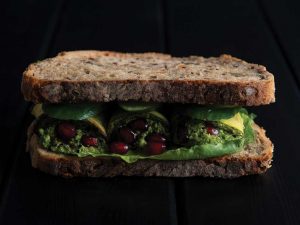 Πολύσπορο ψωμί (αλεύρι σιταριού, αλεύρι σίκαλης, προζύµι σίκαλης, τριμμένο καρότο, νιφάδες βρόμης, λιναρόσπορος, ηλιόσπορους, κολοκυθόσπορους, σουσάμι, γλουτένη σίτου), κολοκυθάκι, πάστα αμυγδάλου (αμύγδαλα, κινόα, σπανάκι, λιαστή ντομάτα, φρέσκο ρόδι, φρέσκο πορτοκάλι, αλάτι, πιπέρι), μαρούλι, αγγούρι.Whole wheat koulouri (whole wheat flour, water, sugar, salt, sunflower oil, margarine, sunflower seeds, yeast), chickpeas, corn, lemon, parsley, fasting mayonnaise (mustard), pickled cucumber (sulphites), onion, lettuce, nori leaves, oat flakes, sunflower seed.